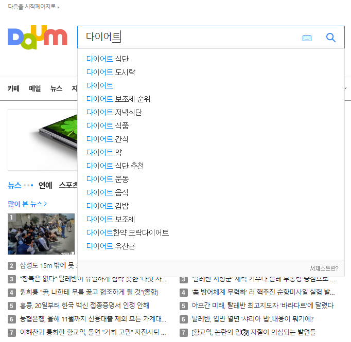 다이어트를 다음의 검색창에 입력해보면 참 많은 연관 검색어가 나옵니다.