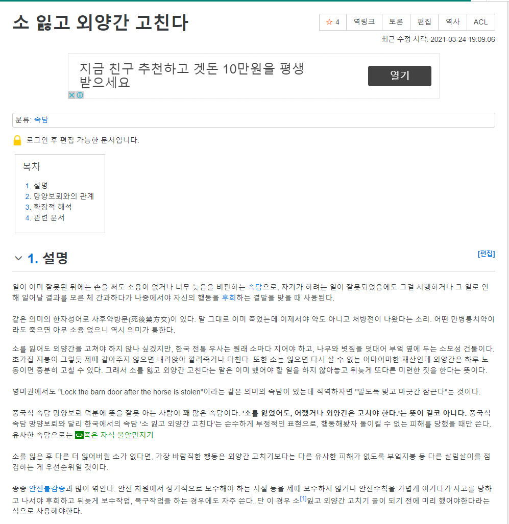 소를 잃어도 외양간을 고쳐야 하지 않나 싶겠지만, 한국 전통 우사는 원래 소마다 지어야 하고, 나무와 볏짚을 덧대어 부엌 옆에 두는 소모성 건물이다. 초가집 지붕이 그렇듯 제때 갈아주지 않으면 내려앉아 깔려 죽거나 다친다. 또한 소는 잃으면 다시 살 수 없는 어마어마한 재산인데 외양간은 하루 노동이면 충분히 고칠 수 있다. 그래서 소를 잃고 외양간 고친다는 말은 이미 했어야 할 일을 하지 않아 놓고 뒤늦게 또 다른 미련한 짓을 한다는 뜻이다.