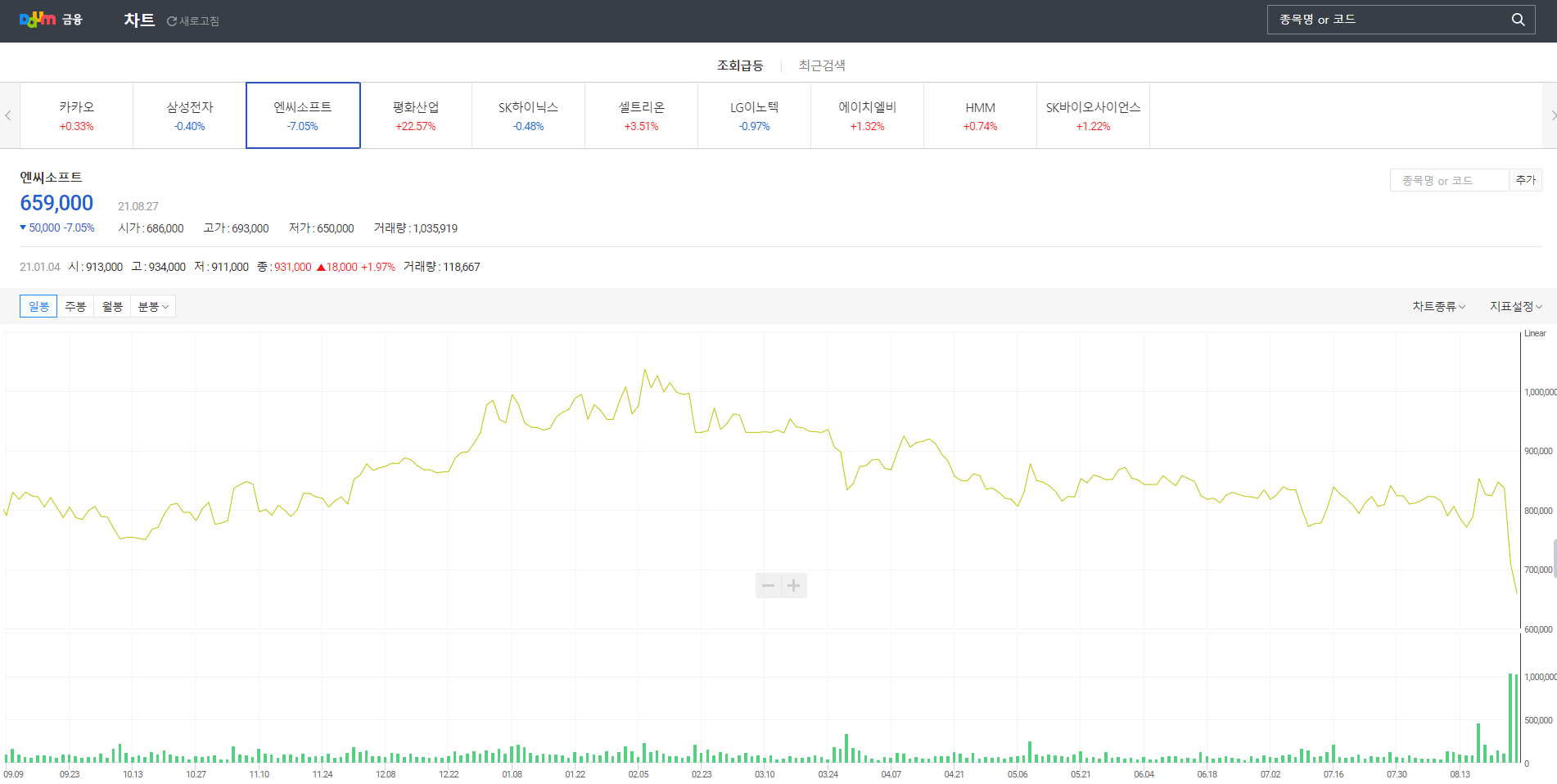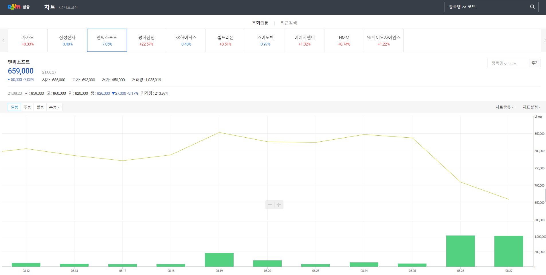 (8월 27일 종가 659,000원, 7.05% 하락)